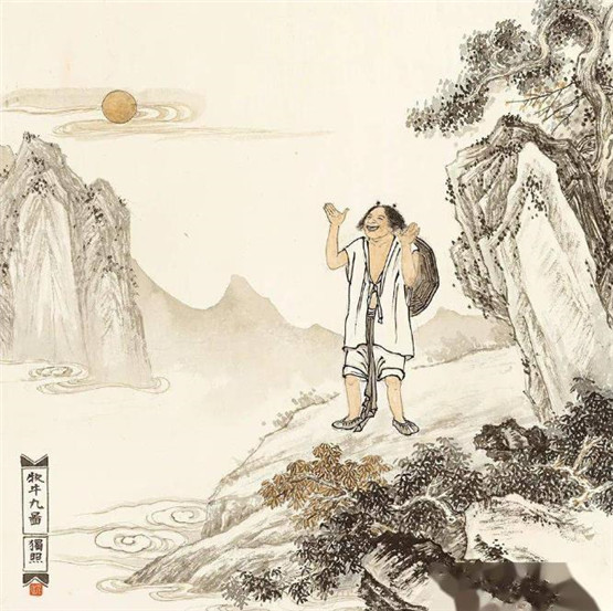 第一是“未牧”,好比恣意咆哮、随意践踏禾苗的野牛。第二是“初调”,已经穿上了鼻子随着人意牵着走。第三是“受制”,不再乱走,牛绳子可以放松一点。“回首”是第四,癫狂的心境比较柔顺了,但是还要牵着鼻子走。“驯伏”第五,可以自然收放,不必牵了。“无碍”第六,可以安稳不动,不必让人费心。“任运”第七,牧童可以睡大觉了。“相忘”第八,牧人和牛两无心。“独照”第九,到了无牛的境界,人的一切妄心已除。最后“双泯”,则人也不见,牛——心也不见。
