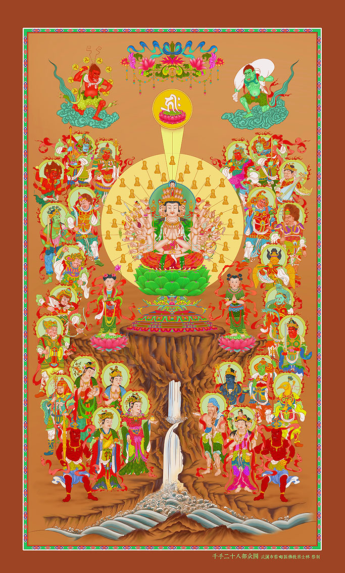 今我蔡甸佛教居士林同仁,感菩薩之悲心,念護法之護持,特依《大悲心陀羅尼經》、《千光眼經》、《十百手陀羅尼守護者名號略釋》《千手觀音造法次第》等經論,并參考清水寺、三十三間堂等處塑像畫像,恭繪大悲千手觀自在菩薩并二十八部護法聖像流通供養。願世人盡體菩薩之悲心,行觀音之慈行。庶不負菩薩久遠劫來頭頭救拔我等流轉凡夫,現種種身說種種法,閉塞六道苦趣令得涅槃正路之廣大慈恩也。
