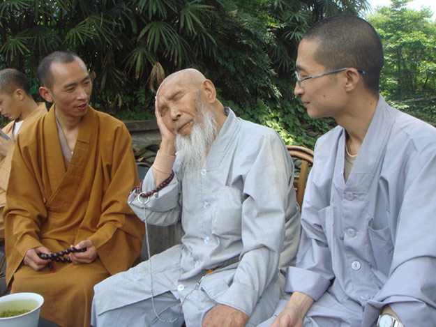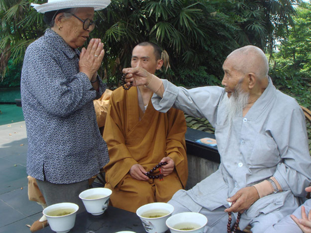 老和尚现在每天都要坐在峨眉山报国寺之佛像开光处,一面念佛,一面为有缘众生赠送念珠,并一一婆心劝诫:念佛、念佛,为众生种下成佛的往因,并深切地强调“念佛就能够成佛”!据统计,多年来他老人家赠送的念珠已达十万之数。