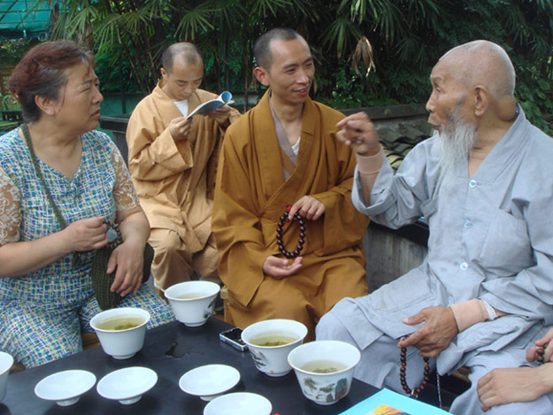 上图为:通永老和尚为一位成都的皈依弟子解答疑问。