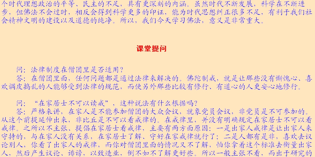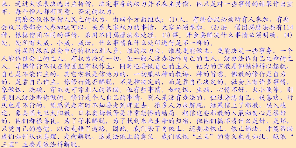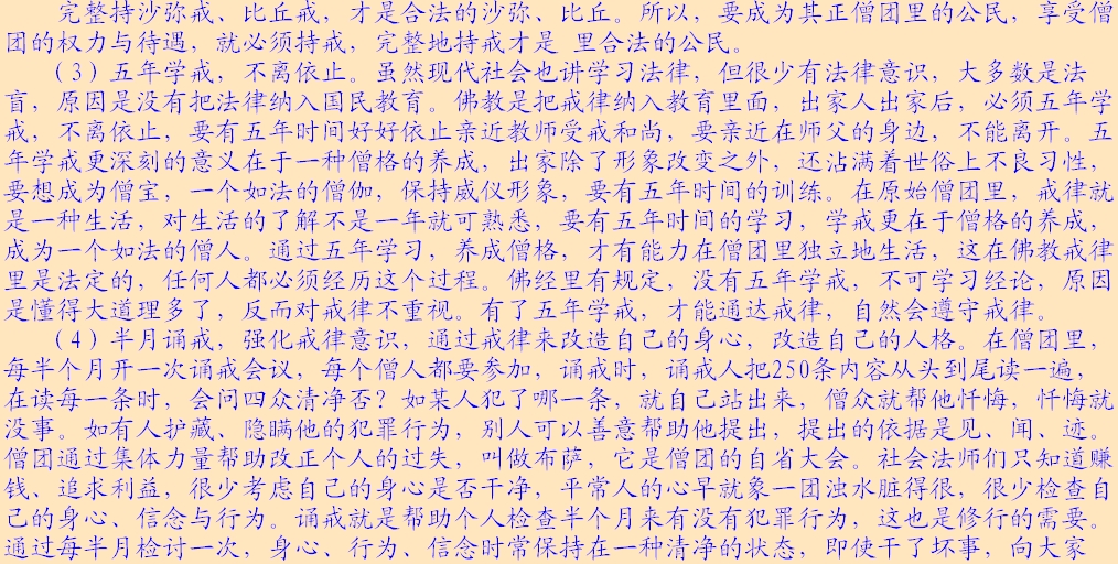 (2)法律面前人人平等。所讲的法律主要指的是戒律,佛以戒为师。《遗教经》讲:戒律就是你们的老师,戒律就是你们的准则,戒律就是你们生活的规范,大家都要以戒作为自己的老师。每位出家人都要受戒,在家居士学佛后,首先受“三皈”,三皈包含着戒的内含。皈依佛,不皈依邪魔外道,这就有戒在里面;皈依法,不皈依外道典籍,也包含着戒;皈依僧,不皈依外道邪众,这又是条戒。在家居士最基本的准则是戒律,就是五戒。佛教徒合格的标准,是以戒律来衡量,如法持戒,才是合格的在家佛教徒。同样,出家也有不同级别的戒律,刚入僧团要受沙弥戒,接着受比丘戒,没有那个僧人是可以不受戒的。看你是否是僧宝,就要看你受戒的级别,戒律是取得某一资格的必然手续。受了菩萨戒,就取得了菩萨的资格;受了比丘戒,就取得了比丘的资格;受了在家戒,就取得了在家居士的资格。