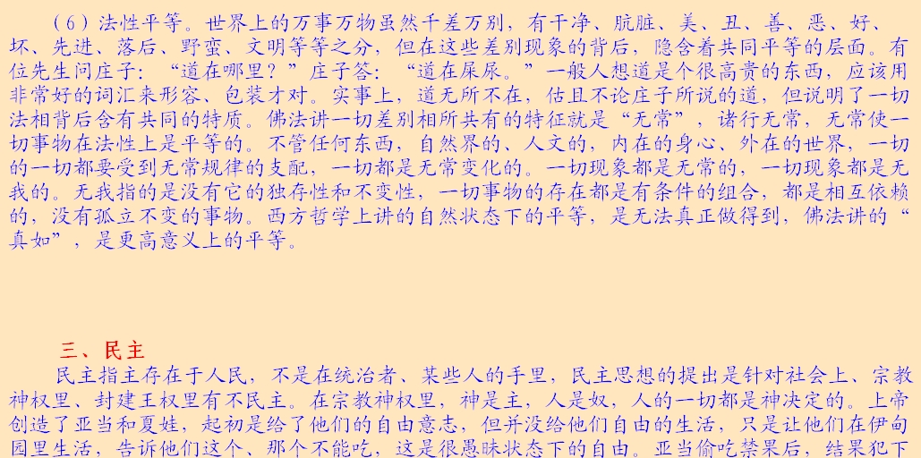 平等是指人的权力在性质和数量上相同,它包含人在自然状态下和社会中权力的两个方面。社会上存在着许多不平等,千万不平等的因素,有宗教神权上的不平等和社会方面的不平等。印度婆罗门教认为人天生存在四种姓差别,四种姓指婆罗门种姓、刹帝利种姓、吠舍种姓、旃陀罗种姓。人是由大梵天创造的,大梵天的嘴巴、肩膀、肚脐、脚底分别创造不同种姓人。人天生就不一样,前三种人可以再生,旃陀罗种姓是贱民,不可以再生。在印度,婆罗门至高无上;刹帝利掌握政权,管理国家;吠舍是从事工商业、资产阶级;旃陀罗则是不可见的人,不允许碰到别人身上,万一碰到了别人,别人可以将其打死,生存的基本权利都没有。ji 督教认为,人是由神决定的,人生下来就有富贵、贫贱之分,生命的起点、天资不一样,人天生就不平等。人死后要遭到上帝的审判,上帝根据你的行为判定升天堂或下地狱。而每个人天生不一样,有些人生存善良家庭里,受到良好的教育,不需要做坏事;有些人从小在盗犯之家,那就该抢劫、偷盗,由此决定着人死后的命运,显然也是不平等的。另外,在社会方面也是不平等的,奴隶与奴隶主、君主与臣民之间肯定是不平等。在封建ZHUAN制国家,皇帝至高无上,官僚等级层次明显,不同层次官僚权力是不一样的,官僚与百姓的权力差别很大。中国古代社会是根据伦理纲常,现代社会还有血统论、民族优越论、职业优越感,总是充满着不平等。以卢梭为代表的西方人本主义认为,人天生就该平等、自由,人在法律保障基础上的社会权力也是平等的,人在自然状态下是平等的,有了私有制后,产生了特权阶级,使社会产生不平等现象,人类社会要通过一种契约方式,建立一种更高级的平等。佛教也讲平等,可以从以下六个方面来说明: