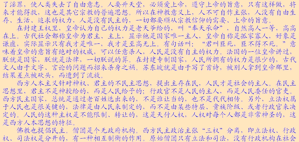 民主制度跟封建ZHUAN制完全不同。我这几年经常去澳州,看后很有感触,在这样一个民主制度的政治环境里,人们能够享受到一种自由、平等的生活。比如说人与人之间是平等的,老百姓和总统之间是平等的,老百姓同政府也是平等的。在澳州,这种例子比比皆是。例如,政府想做一项工程计划,对一个沙滩做些改变,如果老百姓提出反对的话,那么政府就不可以实施。在南澳有个地方,公共汽车已沿用了一百多年,政府想换成现代化的交通工具,而老百姓反对,觉得古色古香要保留,那么政府只好取消计划。 假如一个人开车,可能是超速了,被拍摄了下来,但开车人不服气,说自己没有超速,于是请律师调查,发现警察所用的照相器材是试用期产品,而试用期的产品质量是没有保证的,这样警察将会输掉官司,开车人就不会被惩罚。在澳州,老百姓可以随时监督政府,甚至反对总统。澳州的福利制度非常好,政府能取之于民,用之于民。所以我感觉一种良好的社会制度,对社会的健康发展和民众的幸福是非常重要的。