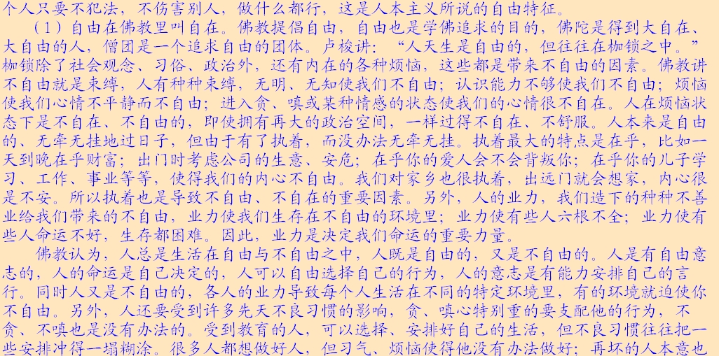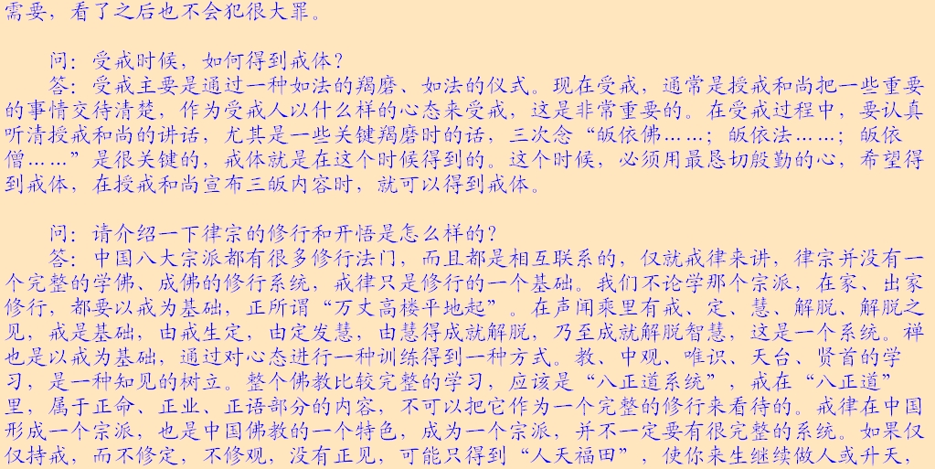 (2)法律面前人人平等。所讲的法律主要指的是戒律,佛以戒为师。《遗教经》讲:戒律就是你们的老师,戒律就是你们的准则,戒律就是你们生活的规范,大家都要以戒作为自己的老师。每位出家人都要受戒,在家居士学佛后,首先受“三皈”,三皈包含着戒的内含。皈依佛,不皈依邪魔外道,这就有戒在里面;皈依法,不皈依外道典籍,也包含着戒;皈依僧,不皈依外道邪众,这又是条戒。在家居士最基本的准则是戒律,就是五戒。佛教徒合格的标准,是以戒律来衡量,如法持戒,才是合格的在家佛教徒。同样,出家也有不同级别的戒律,刚入僧团要受沙弥戒,接着受比丘戒,没有那个僧人是可以不受戒的。看你是否是僧宝,就要看你受戒的级别,戒律是取得某一资格的必然手续。受了菩萨戒,就取得了菩萨的资格;受了比丘戒,就取得了比丘的资格;受了在家戒,就取得了在家居士的资格。