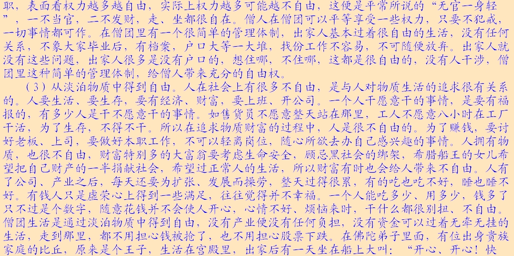 (3)出家人在僧团里面平等享有各种权利。出家人平等享受僧团的财富,僧团是“六和”团体,“六和”里有一条是利合同均,僧团里的利益是大家平等享有的。私有制是人类社会不平等的根源,在现实社会团体里往往由于财富的不平均而产生纠纷,股份公司里,谁的钱多,谁说话就算数,钱多的人要比钱少的人权力大。整个社会由于财富的不均,往往造成许多纷争、矛盾与对立,很多问题都是由于财富引起的。佛陀建立的是一个解脱的僧团,为了避免出家人在财富上的纠纷,避免由于财富造成僧团里的不平等,而形成特权阶级,佛陀规定出家人在财富的享受上是平等的,在衣服、饮食、居住环境各方面,戒律都是有规定的。