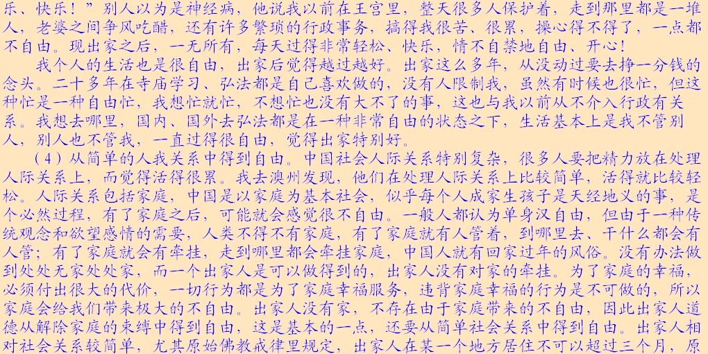 二是从内心深处去掉我执,达到无我的境界。一个人放弃了财富,内心里边就能作到什么占有欲都没有吗?你的私心就没有了吗?事实上做不到的。因为人的私心、我执是根深蒂固的,是无始以来的积累。所以一个人出家之后,还需要不断的修行,修行的过程就是克服自我、超越自我的过程,是从有我达到无我的过程。一个证得阿罗汉果的人是彻底通达无我的,这个过程是要通过勤修戒定慧来完成的。“戒”就是通过戒律来割离你对世俗占有的贪著;“定”就是降伏你的自私及由自私引起的种种烦恼的心态。由于我们有私心、有我执,而使得我们妄想纷飞,一天到晚地在考虑自身利益或人际关系,什么我的得失、荣辱、恩怨等等,很多人就在这妄想之中转来转去。佛法告诉我们不要把心安住在这些上面,而要把心安住在法上,比如安住在无常、佛号上,通过念佛,心就会慢慢静下来,妄想就会少很多。或者把心安住在菩萨道的修行上,菩萨道是通过在利益他人之中来完善自己的。一个人如果整天只考虑自己,烦恼就会很多,患得患失就会越来越严重。如果我们整天考虑众生,考虑别人的幸福,我们的烦恼就会越来越少,我们的思想境界就会得到不断的提高。只有众生的事,没有自己的事,我执就会越来越淡。我们要通过布施来克服自己的悭贪,许多人都有这种毛病,悭贪就是吝啬、小气,就是对占有的财产很执著。有些人,不但舍不得给孩子、妻子、父母、他人用,而且自己也舍不得用,把钱存起来放着不用才觉得高兴。菩萨的修行就是“不为自己求安乐,但愿从生得离苦”。佛法的修行就是一方面在生活上的舍弃,一方面在内心上的薰修,从有我慢慢达到无我的境界。