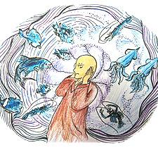 杀生业力的果报,犹如孙悟空头上的紧箍咒,如影随形等待因缘具足时现前。曾经于本会挂单的吉祥法师,多年前未出家时,曾有一段时期嗜吃生勐海鲜,并在海鲜店前指定生吃、烹煮鱼虾类,以满足口腹之慾。不料今年5月其病倒后,所有她吃过的生命全都来讨债,于其病中昏沉时现身撞她的头、咬她的嘴,并现牠们当时遭屠杀与被生剥活吃的形相,这种被紧追催命身历其境的恐怖现象,让她惊恐万分、苦不堪言,自知这是「现世现报」。