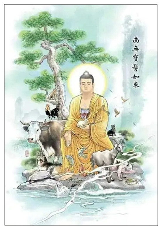 水流又慈悲想到:我以前在一比丘前听受大乘佛法时,他曾说过——任何众生临死时,如能在其耳边念诵宝髻如来名号,都能使其转生善趣。看来我亦应给这些鱼传授甚深缘起法,还要为它们念诵佛号。当时身处赡部洲之众生,有些对大乘法有信心,而有些却毁谤不止。水流则义无反顾走进水池,待水没膝时,水流开始大声念诵“顶礼圆满如来正等觉宝髻佛”,然后又宣说此生彼生、有此有彼,及无明生行、无明灭则行尽及至最终灭尽大痛苦等缘起正法道理。