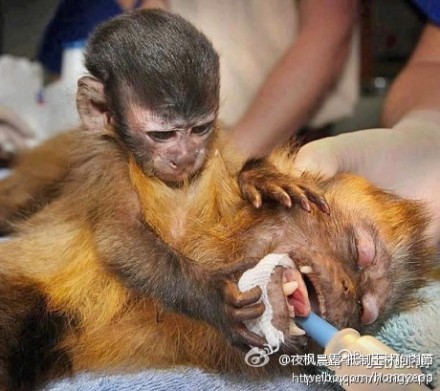 这张照片很震撼——在澳大利亚墨尔本动物园,僧帽猴宝宝,拥抱她的母亲凯西。它妈妈受伤了,它的孩子很痛苦,在哭,谁说他们没有感觉吗?它们的感受能力,或有意识地察觉能力和人类是一样的,它们一样会為亲人的痛苦而痛苦,生命都是一样的。只有人类不尊重它们的感知!