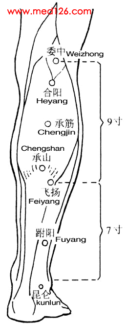 2.便秘、脱肛、痔疮等。该穴为人体足太阳膀胱经上的重要穴道之一,为治疗小腿痉挛,腿部转筋的常用效穴。