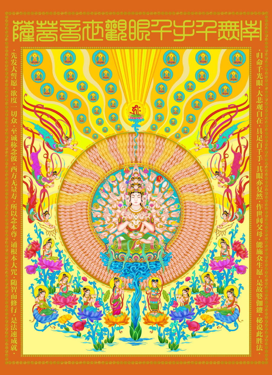 观音菩萨随类化身而示现种种不同的身分,如鱼篮观音、送子观音、白衣观音、足踏鳌头观音、八臂观音、十六臂观音、千手千眼观音等,这是大家都知道的。于 中,千手千眼观音,有很多人不大理解,普通人所了解的,一个人只有两手两眼,假使一个人很能干,很有本领,我们就说他了不起,好像具有三头六臂似的。听说 具有三头六臂的人,我们已经把他看成很了不起,而观音菩萨具有千手千眼这么多,其力量当然是更大。所以有人问:观音菩萨为什么会有千手千眼?它究竟代表了 什么意义?这有略微解释的必要,不然,不只会被人问到将无辞以答,就是自己对这亦将具有很大的怀疑,不能如法的虔诚的称念观音菩萨的圣号。