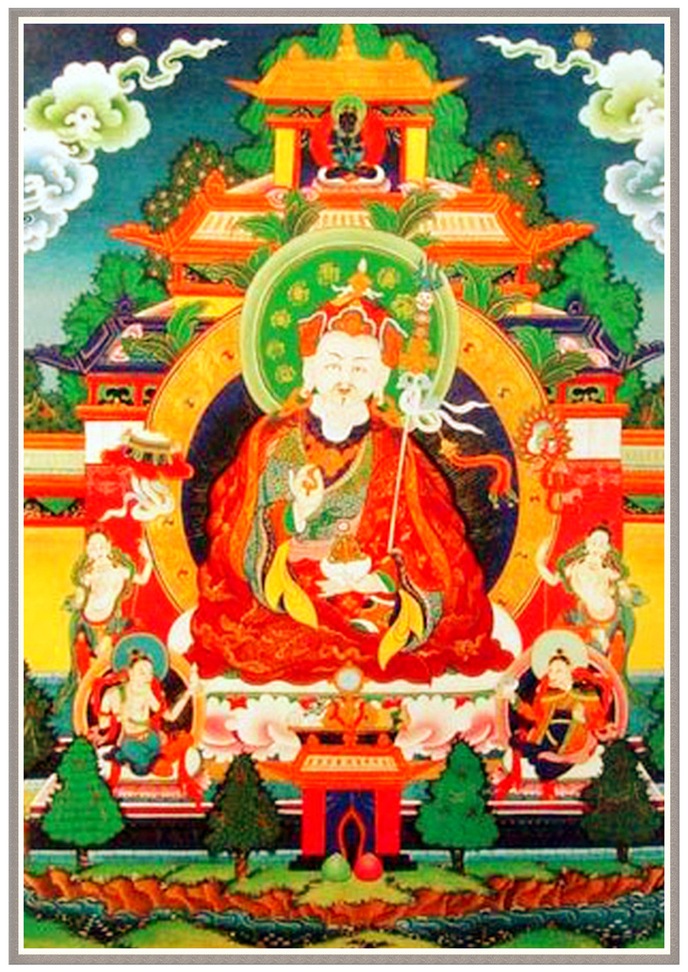 这幅唐卡所绘为财神护法曼荼罗,可以说是藏密财神的大聚会。其中中央主尊为财神护法毗沙门,主尊下方为白财神及其眷属,两侧为财宝天王的化身。坛城第二圈在表示八个方向的位置绘有财神的八位护法,他们分属八方,分别持不同的器物。坛城第三圈绘有八个龙女,手托摩尼宝。最外圈坛城绘有四大天王,分别位于四方,守护坛城。唐卡上界绘有金刚上师及历代传承上师。