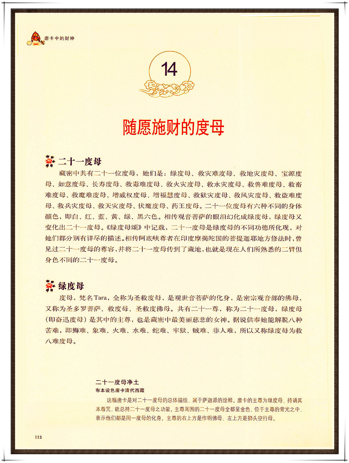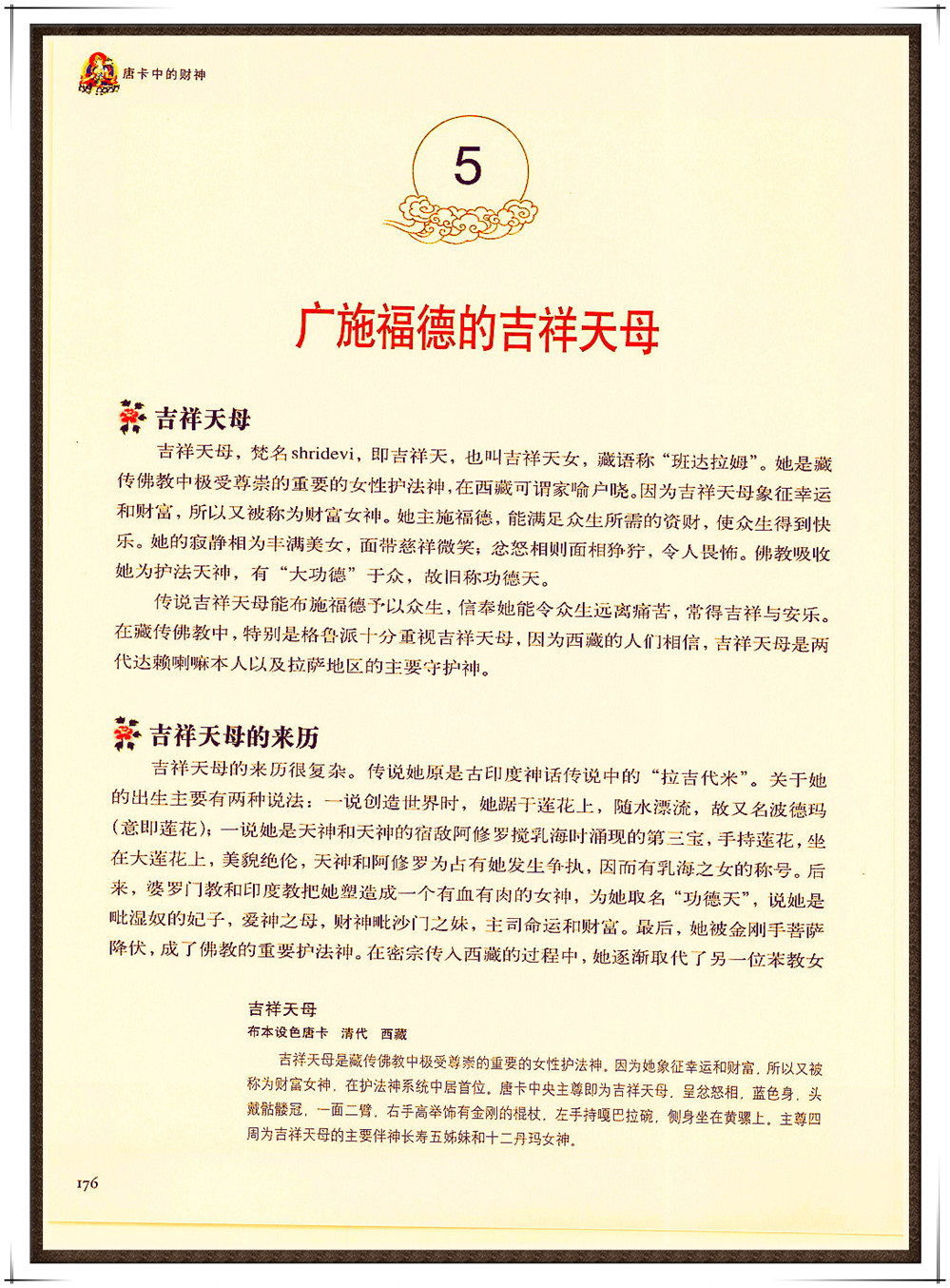唐卡作为雪域高原文化的瑰宝,其题材囊括了宗教、历史、民俗、思想观念等方方面面,因此又被称为了解西藏的百科全书。展开一幅幅唐卡,财宝的形象随处可见,这些光彩夺目的璎珞、黄金、琉璃,都是佛教神明布施福德、智慧的象征。《唐卡中的财神》一书正是以此为立足点,主要从佛教的财宝观、财神法、财宝本尊、诸天护法财神及常见宝物这五个角度,通过100多幅精美的唐卡作品,为您全面揭示藏密财神及财宝本尊的内涵。