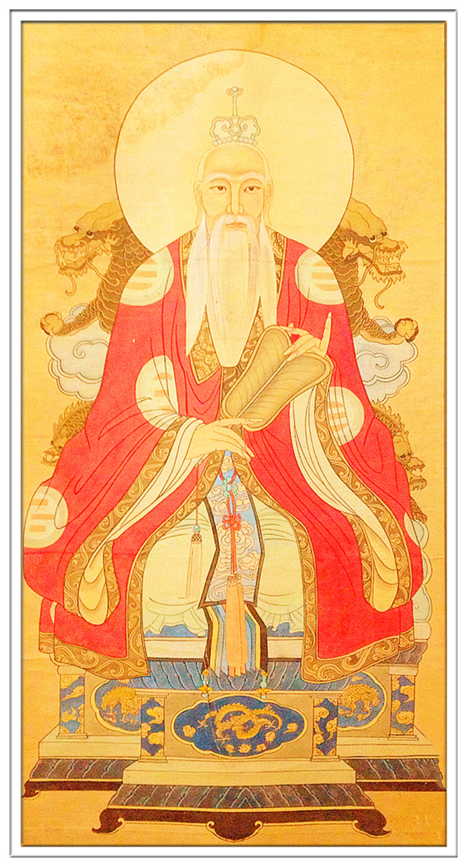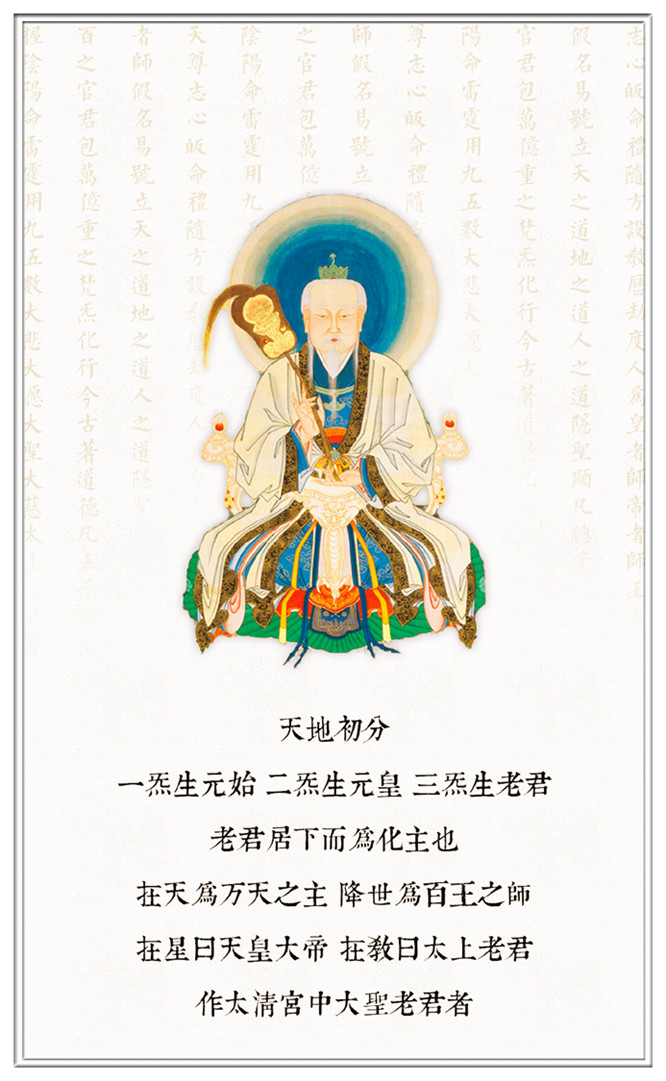 随方设教,历劫度人。为皇者师,帝者师,王者师,假名易号。立天之道,地之道,人之道,隐圣显凡。总千二百之官君。包万亿重之梵炁。化行今古,著道德凡五千言。主握阴阳,命雷霆用九五数。大悲大愿,大圣大慈,太上老君,道德天尊。