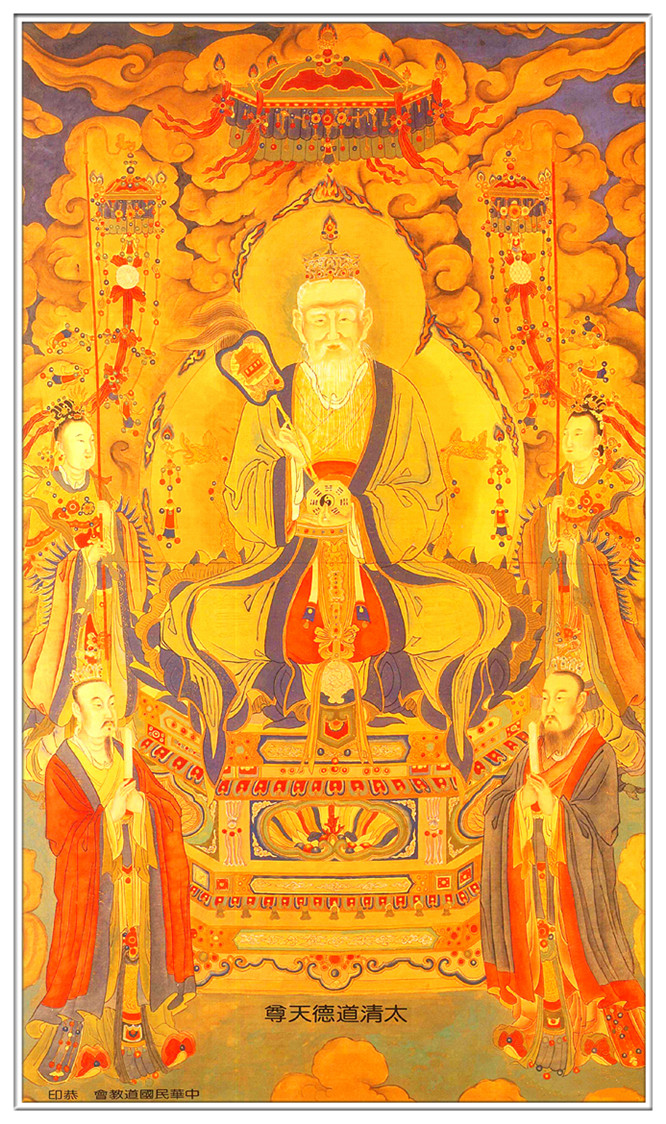 道的显化,就是太上老君,所以《老子想尔注》中说“散则为气,聚则为太上老君”。老君,又以神通变化,于黄帝时代化身为崆峒山的广成先生,传授轩辕黄帝无为之道,故而谓之“帝者师、王者师”;早些劫数前,老君化号为“金真静老天尊”,于本劫化身为周朝的“老聃”,应尹喜真人之,在西游函谷关之前留下了洋洋五千言的《道德经》,后人尊为“道祖”。