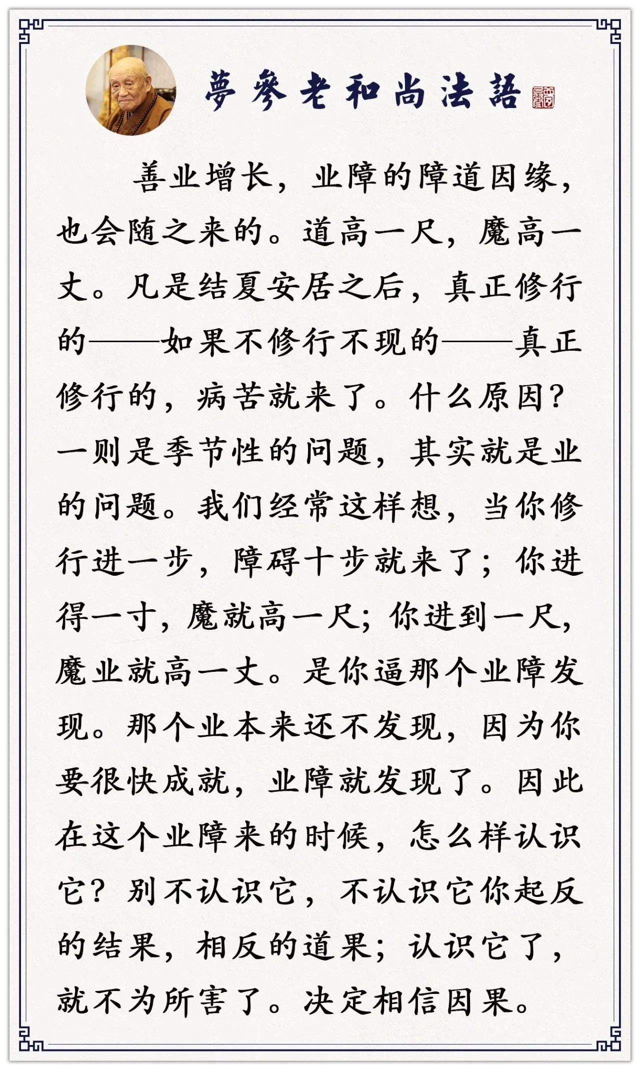 在你没有发心的时候,什么事都没有,刚一发菩提心想行菩萨道,障缘就来了。第一个是害病,身体四大不调病就来了,要是能克服过去,道业向上增长。你越用功越精进、道力越增高,魔障越大。俗话说:“道高一尺,魔高一丈。”
