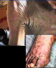 中午时分,众居士来到「蛇人——韩永波」的家裡,果然,众人目睹韩永波盖着厚厚的棉被,躺在炕上,只露出头部。打开被子,众居士被眼前的景象惊呆了,韩永波面部及全身都呈紫黑色,褶皱佈满全身,一层层白色的鳞片彷彿蛇皮一般,全身痛痒难忍,两手使劲不停地抓挠,脱落的鳞片像雪花一样洒落在被褥上,他咧着嘴,痛苦的呻吟着,好像在乞求上帝对他的宽恕。