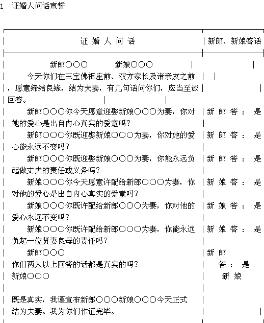 婚礼开始→鸣炮→奏乐→介绍人礼佛入席→主婚人礼佛入席→证婚人引导新郎、新娘入席→唱炉香赞→新郎、新娘上香→证婚人为新郎、新娘问话宣誓→新郎、新娘行结婚礼→证婚人宣读结婚证书→证婚人为新郎、新娘交换礼物→新郎、新娘用印→主婚人用印→介绍人用印→证婚人用印→新郎、新娘向亲友行叙见礼→唱佛化婚礼祝福歌 证婚人开示→介绍人致词→来宾致词→主婚人致谢词→新郎、新娘向证婚人礼谢→恭送证婚人退席→新郎、新娘向介绍人礼谢→新郎、新娘向主婚人礼谢→新郎、新娘向来宾亲友礼谢→礼成→奏乐→鸣炮