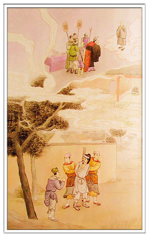 吴越王信仰佛教,深知他盗用库钱,全在放生。因此命执行刑罚官,在临刑时,注意观察他的言词容色,前来禀报。大师身临刑场,脸上毫无忧戚的表现,大家都觉得很奇怪,大师说:‘我对库钱,毫无私自使用,全部买物放生,如今死了,直生西方极乐世界,岂不是一大乐事?“吴越王听了他的话,就赦免了他的罪。大师从此出家为僧,勤修禅定,礼佛拜忏,获得无碍辩才。