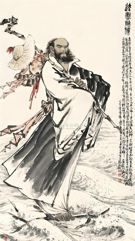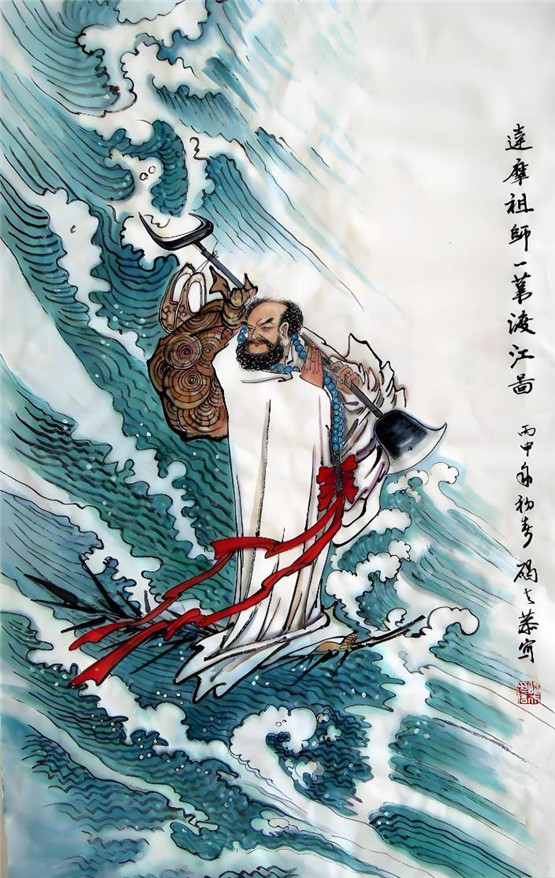 达摩走后,梁武帝有所醒悟,派人想要追回达摩。在江边,达摩见有人赶来,随手折了一根芦苇投入江中,化作一叶扁舟,飘然过江北上。另有一版本,传说是神光法师(即后来的二祖慧可)意欲向达摩求法,紧紧追赶而来之时,达摩一苇渡江。后世许多的文人,都先后根据这个典故创作了大量的书画作品。达摩,作为中国禅宗的始祖,也成为了佛教艺术题材的重要人物。