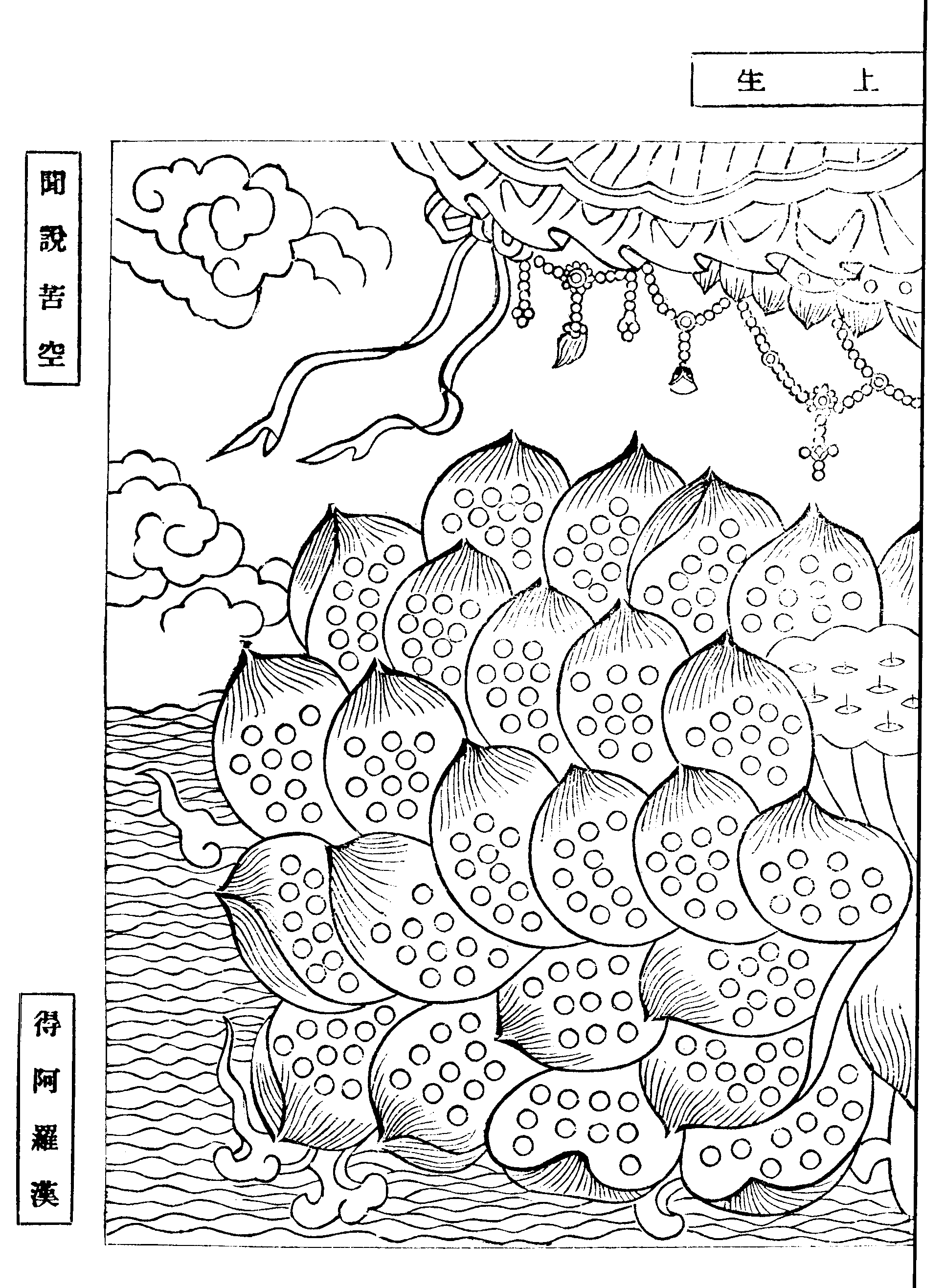 右九品莲台及大圆镜图。共四千八百圈。每诵佛名十串。以朱点一圈。合各串零头。约得五百万之数。积久点满。又以黑白青黄四色点之。分点五次。计得二千五百万。填满后再易新本。若能勤行精进。每点各加十倍。以万当千。更好。其旧本或向佛前焚化。或俟临命终时焚化。仗此胜因。决生净土。每本填满。即注云。