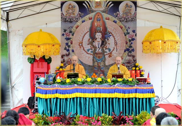 在我们佛教徒里,受过三皈依才能穿这个衣服,我们今天法会的现场就是具足了佛法僧三宝,具足佛的法、报、化、功德事业,是具足了一切加持的地方,我们坐在这个法堂里就是无上的庄严。