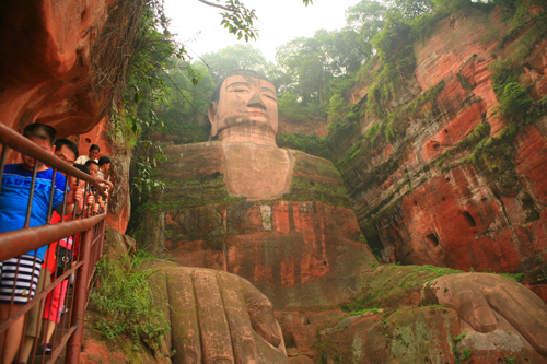 乐山大佛----世界上最高的石刻弥勒坐佛。乐山大佛,位于岷江、青衣江、大渡河三江汇流之处,依山凿成,有“山是一尊佛,佛是一座山”之称。其浩大的工程前后延续约90年,历经三代人和四个皇帝。据说,大佛头顶的螺旋发髻有1051个,而大佛脚的大拇指指甲上可以坐上5个小孩。郑伊健、郭富城《风云》,刘晓庆《神秘的大佛》便是在此拍摄完成的。