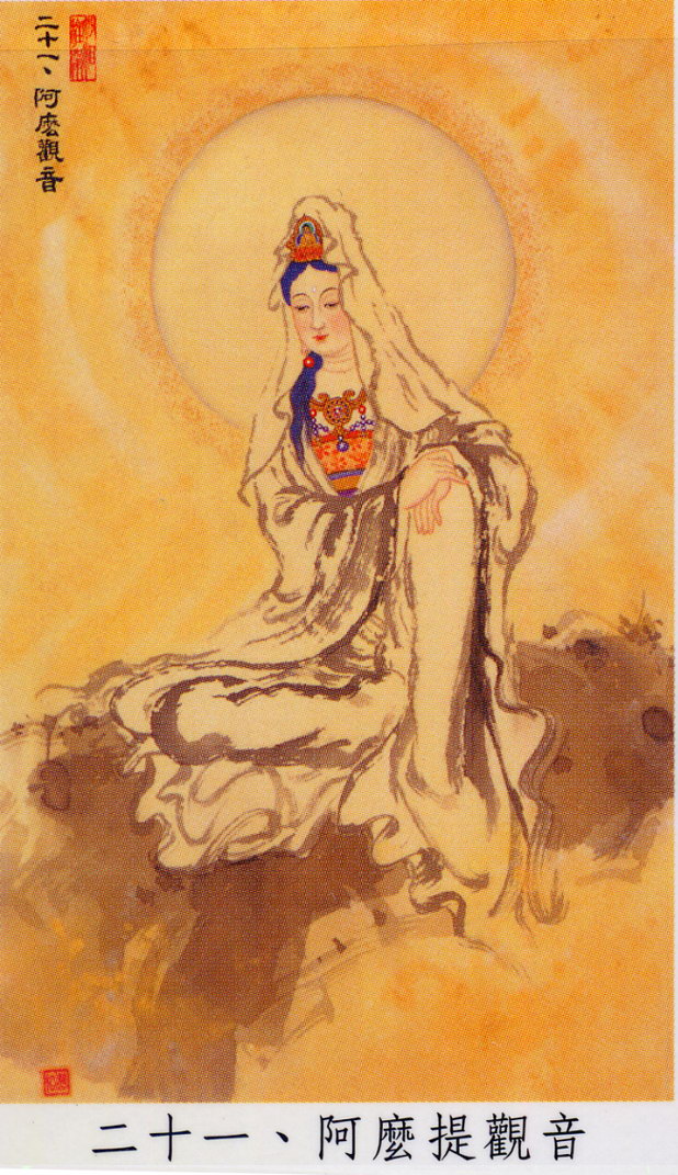 二十一、阿摩提观音(宰官妇女身):常乘白狮子而身放火光之像,四臂分持摩竭鱼、白吉祥鸟、凤头箜篌。表无畏之义。或释为表卅身中之毗沙门身