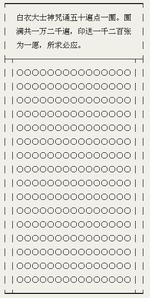 白衣观音大士,即是身着白衣的观世音菩萨的形象,亦称“白衣观音”、“大白衣”等。此咒原名为《随愿陀罗尼》,选自《法苑殊林》第六十卷《咒术篇》。诚心读诵此咒,必有感应。读的遍数越多越好,可以消除一切灾殃魔难。